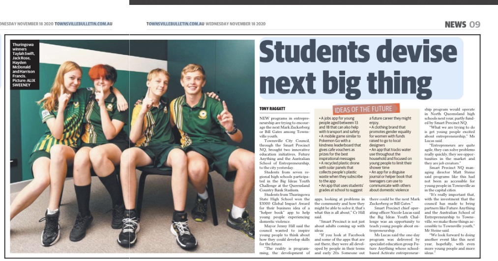 Courier Mail, 28 Dec 2020 ($). Read more. https://www.couriermail.com.au/subscribe/news/1/?sourceCode=CMWEB_WRE170_a_GGL&dest=https%3A%2F%2Fwww.couriermail.com.au%2Feducation%2Fschools-hub%2Fqld-year-9-students-design-may-revolutionise-shark-nets%2Fnews-story%2Ff2a54d51a86a9a3263341fde7cce1ace&memtype=anonymous&mode=premium